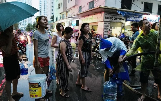 Người dân tại chung cư HH Linh Đàm (quận Hoàng Mai) đội mưa chờ lấy nước sạch từ xe téc, do nước sạch sông Đà xuất hiện mùi clo và khét từ nhiều ngày nay.