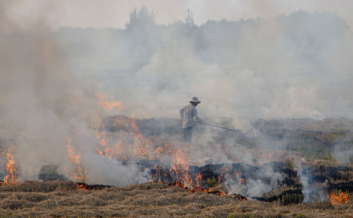 Sau vụ lúa đông xuân, nông dân đốt rơm rạ ngay trên cánh đồng khiến khói mù mịt, cản trở tầm nhìn của người đi đường.