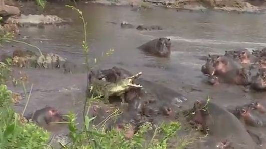 Đoạn video ghi lại hình ảnh hơn 30 con hà mã đang đánh tơi bời một con cá sấu tại Serengeti, Tanzania khi kẻ đi săn có ý định tấn công hai hà mã con.