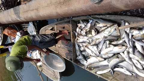 | Sau một đêm hơn 10 tấn cá của người dân xã Thành Vinh chết không còn một con. |