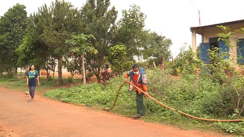 Có đồng hồ nước nhưng không có nước, nhiều người dân trong khu tái định cư buôn Bu Prăng 1 (Tuy Đức, Đắk Nông) phải kéo ống, xin nước về sinh hoạt.