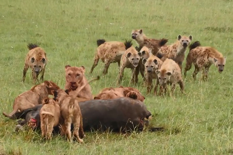 Thấy 3 con sư tử cái cùng đàn con của chúng đang ăn thịt trâu rừng tại Khu bảo tồn quốc gia Maasai Mara (Kenya), bầy linh cẩu tiến lại gần với ý định cướp mồi của đối thủ. Sau đó, cuộc giao chiến ác liệt diễn ra.