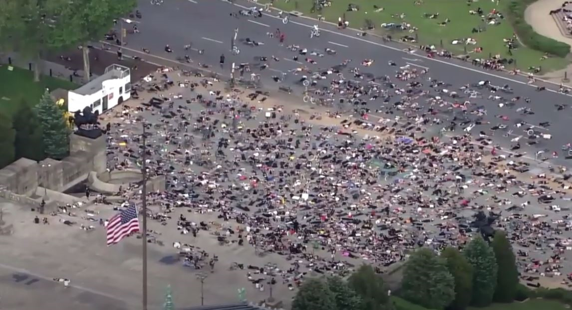 Người biểu tình tụ tập bên ngoài Bảo tàng Nghệ thuật Philadelphia, phản đối sự tàn bạo của cảnh sát gây ra cái chết của George Floyd. Hàng nghìn người nằm sấp dưới đất trong tư thế cho hai tay quặt ra sau lưng trong gần 9 phút, mô phỏng lại trạng thái cuối cùng của Floyd trước khi chết, cùng hô "tôi không thể thở được".