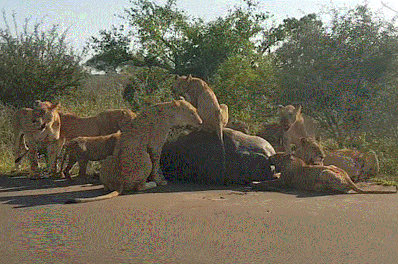 Trong clip, dù có rất nhiều xe cộ và khách tham quan, bầy sư tử vẫn thản nhiên giết và ăn thịt trâu rừng ngay trước mặt họ.