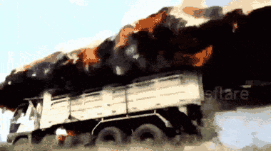 Một xe tải chở cỏ khô bốc cháy dữ dội khi đang vận chuyển trên đường tại tỉnh Lopburi, Thái Lan.
