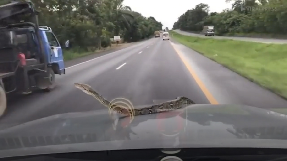 Video: Đang lái xe, tài xế hoảng hốt thấy trăn bò trên nắp capo