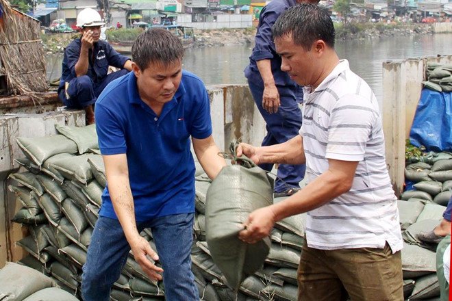 Quận 8 huy động gần 100 người khắc phục sự cố vỡ bờ kè ở đường Mễ Cốc trước khi triều cường lên đỉnh lúc 16h30 hôm nay.
