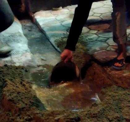 | Sau khi đám cháy xảy ra, nhân viên cây xăng nhanh chóng múc nước chứa xăng đang chảy ra cống phía ngoài đường Láng đổ đi. (Ảnh: Vũ Thái) |