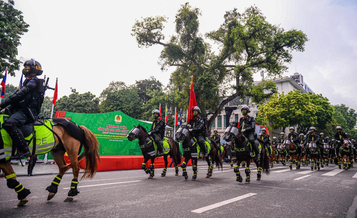 Đoàn cảnh sát kỵ binh diễu hành quanh phố đi bộ hồ Gươm trong khuôn khổ Nhạc hội Cảnh sát các nước ASEAN 2022.