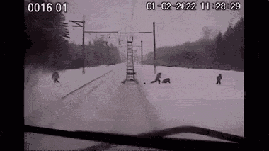 Nhóm công nhân đang sửa chữa đường sắt tại Kaluga (Nga) nhìn thấy đoàn tàu lao tới, liền nhảy khỏi thang bỏ chạy tán loạn.