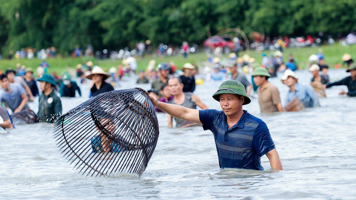 Sau hồi trống khai hội, hàng nghìn người dân ở xã Xuân Viên (Nghi Xuân, Hà Tĩnh) lao xuống đầm nước bì bõm bắt cá với mong muốn sẽ gặp nhiều may mắn.