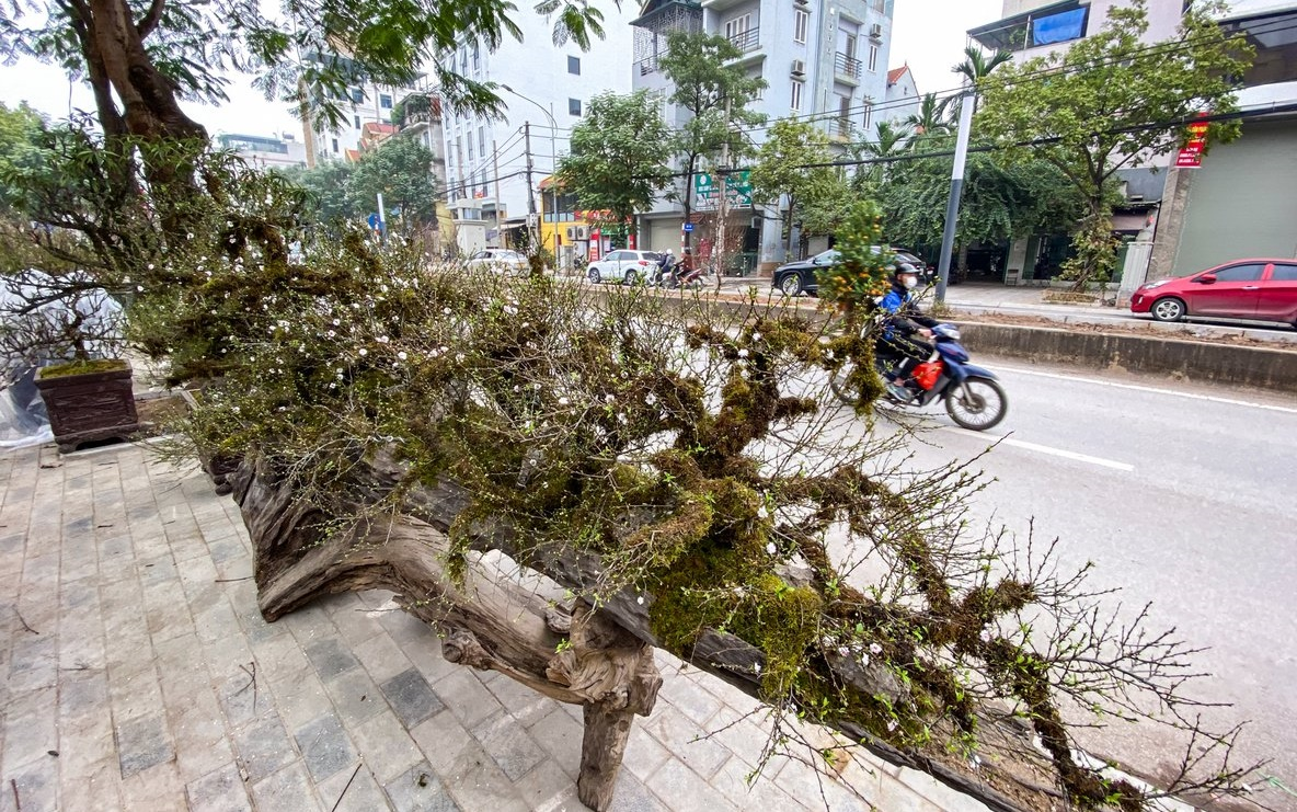 8 cây nhất chi mai được tạo dáng trên khúc gỗ độc mộc hình dáng con thuyền dài 4m được bày bán tại chợ hoa Lạc Long Quân (Hà Nội) thu hút sự chú ý của nhiều người.