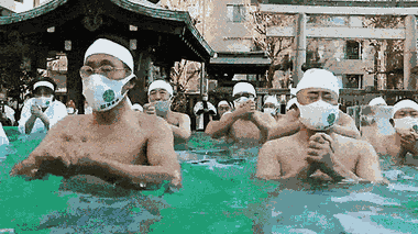 Hơn 20 người đeo khẩu trang ngâm mình trong bể nước đá tại đền Teppozu Inari (Tokyo, Nhật Bản) để cầu nguyện cho một năm mới khỏe mạnh.