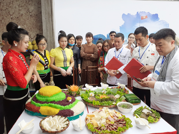 Độc đáo nhất tại hội thi ẩm thực 8 tỉnh Tây Bắc đang diễn ra tại Hà Giang là mâm xôi ngũ sắc cách điệu hình ruộng bậc thang, một trong những đặc trưng của vùng.
