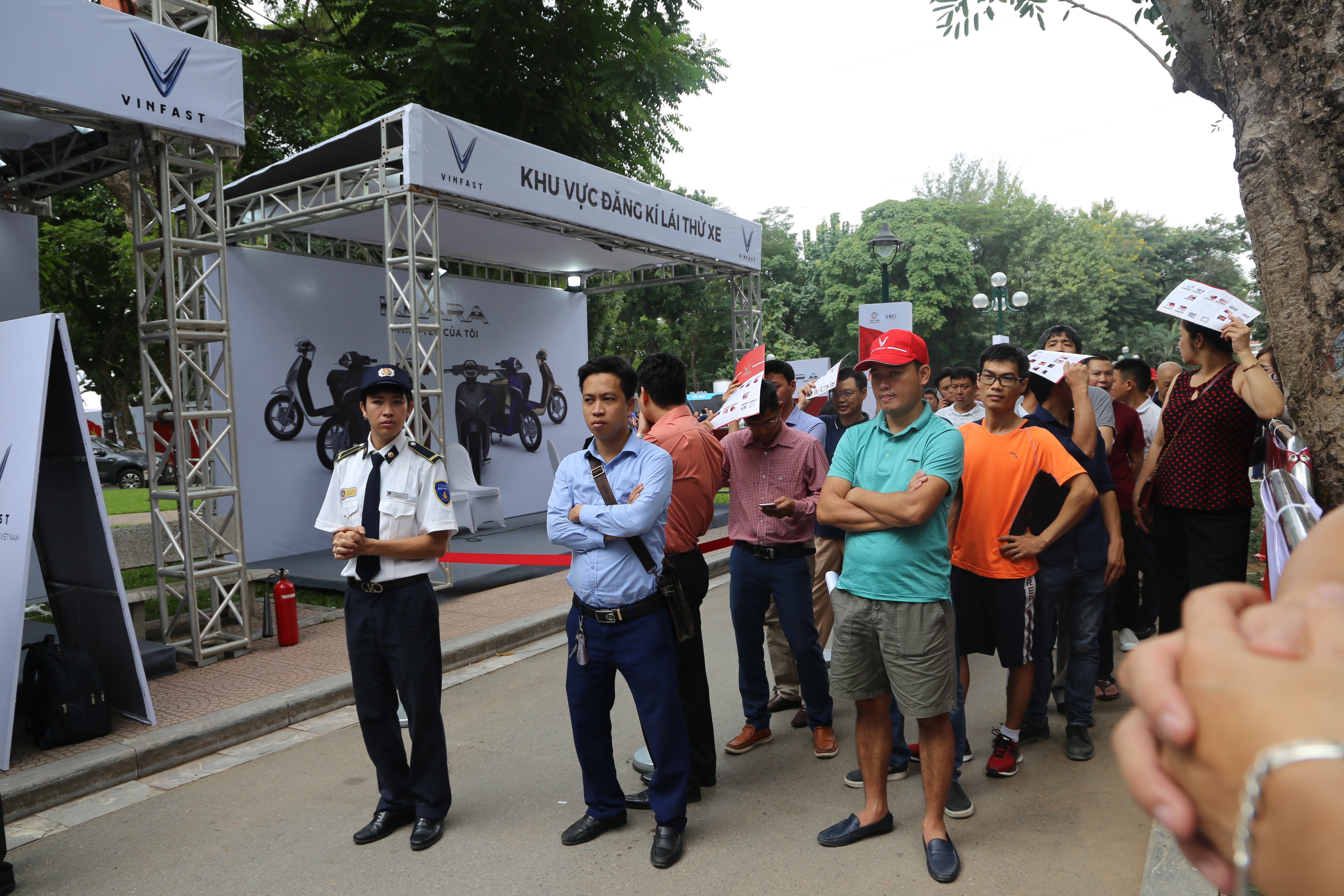Sáng 21/11, người dân có mặt khá đông tại công viên Thống Nhất (Hà Nội) chờ đăng ký mua xe máy điện và ô tô của VinFast.