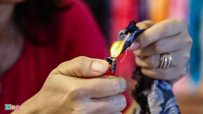Để phân biệt lụa tơ tằm hay pha, nghệ nhân tại làng lụa Hội An (Quảng Nam) thường dùng lửa đốt, hướng dẫn cho du khách.