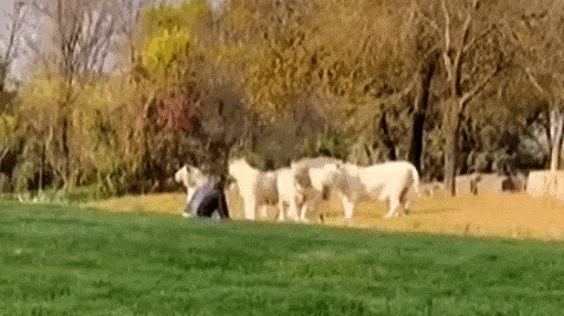 Một du khách tham quan Công viên động vật hoang dã Bắc Kinh, bất ngờ ra khỏi xe, nhảy vào khu vực của đàn con hổ trắng và gây ra tiếng động để khiêu khích chúng.