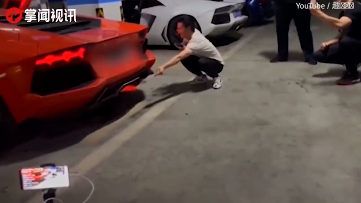 Người đàn ông ngồi phía sau chiếc Lamborghini, giơ que xiên thịt vào chỗ ống xả đang phụt ra lửa ở Trung Quốc.