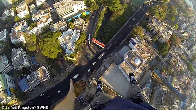 Với chiếc camera gắn trên đầu, James Kingston thanh niên 24 tuổi đến từ nước Anh dần dần chinh phục từng cao độ trên chiếc cần cẩu chênh vênh trước khi thoải mái đứng nhìn toàn thành phố Bangalore của Ấn Độ mà không cần thiết bị bảo hộ.