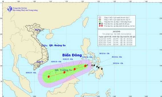 (VTC News) - Do ảnh hưởng của bão Jangmi, từ chiều nay (31/12) khu vực phía Đông Nam biển Đông (bao gồm vùng biển phía Đông quần đảo Trường Sa) có gió mạnh cấp 6, sau tăng lên cấp 7, vùng gần tâm bão đi qua mạnh cấp 8, giật cấp 9-10.