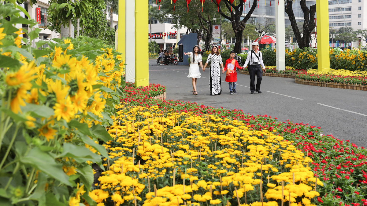 Đường hoa Phú Mỹ Hưng (quận 7, TP.HCM) có chủ đề "Sắc xuân hội ngộ" dài 700 mét, trang trí nhiều tiểu cảnh Tết đặc trưng của 3 miền và một số quốc gia trong khu vực.