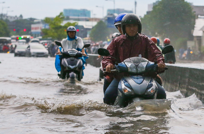 Cơn mưa kéo dài trong giờ tan tầm khiến tuyến đường Phạm Văn Đồng (TP.HCM) ngập sâu quá bánh xe máy gây kẹt xe kéo dài.