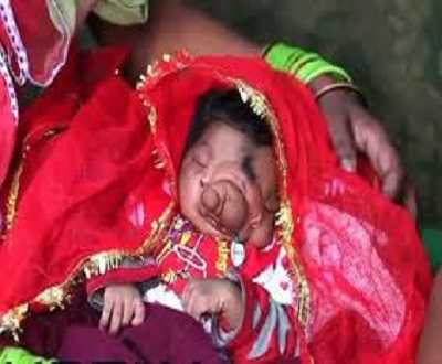 Được biết, bé gái đáng thương này chào đời tại một ngôi làng thuộc thành phố Aligarh, bang Uttar Pradesh. Phần lồi ra giữa đôi mắt che khuất mũi trên khuôn mặt bé khiến dân làng tin giống với ngà voi của thần Ganesha. Họ gọi em với cái tên là "vợ thần Ganesha".