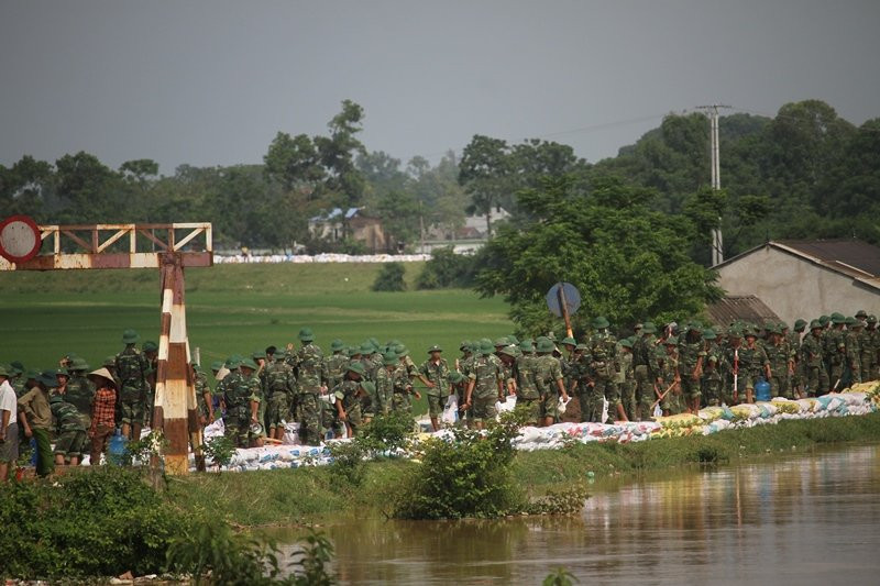 Sau trận mưa đêm qua, nước tại khu vực sông Nứa (Chương Mỹ, Hà Nội) dâng cao, nguy cơ tràn đê lớn, ngay trong đêm và ngày 30/7, quân và dân huyện Chương Mỹ đã tập chung hộ đê tránh nước tràn.