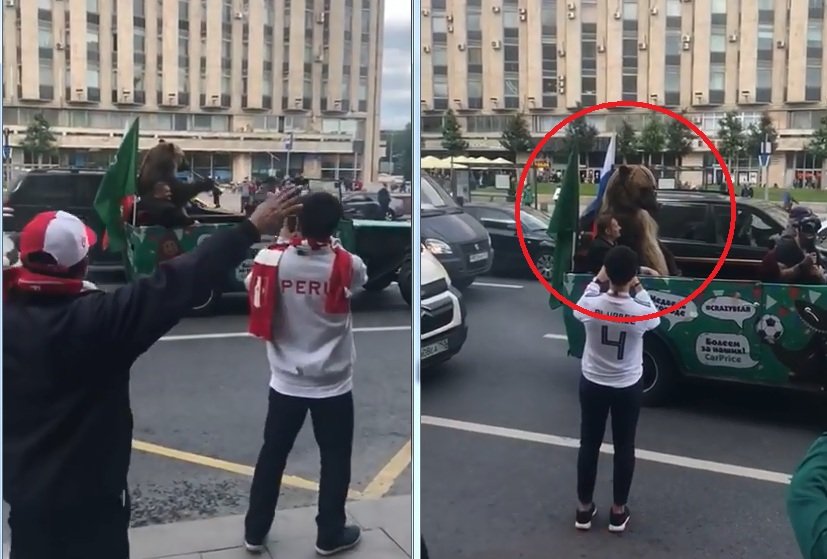 Trong không khí ngày khai mạc World Cup 2018, một chú gấu cũng gây xôn xao khi xuất hiện giữa đường phố ở Nga. Con vật có kích cỡ to gấp đôi người này ngồi trên một chiếc xe có gắn cờ Nga và Ả Rập Xê Út, hai đội bóng thi đấu trận khai mạc. Chú gấu thậm chí còn cầm một chiếc kèn Vuvuzela lên thổi khiến người đi đường thích thú.
