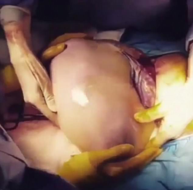 Tuy nhiên, ca sinh nở được ghi lại trong video này thì em bé vẫn nằm trong túi ối và các bác sĩ phải dùng tay chọc thủng túi ối sau đó kéo em bé ra ngoài. Hình ảnh video cho thấy, trong vài giây khuôn mặt em bé chạm vào lớp màng của túi ối và hiện hẳn lên.