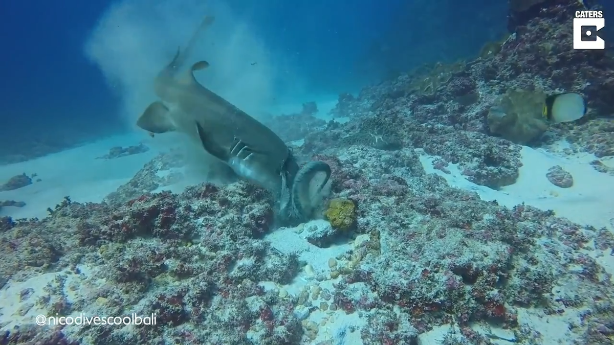 Đoạn video được ghi lại ở Manta Point, Bali cho thấy, chỉ ít giây ngắn ngủi, con cá mập háu đói nhanh chóng nuốt trọn chú bạch tuộc.