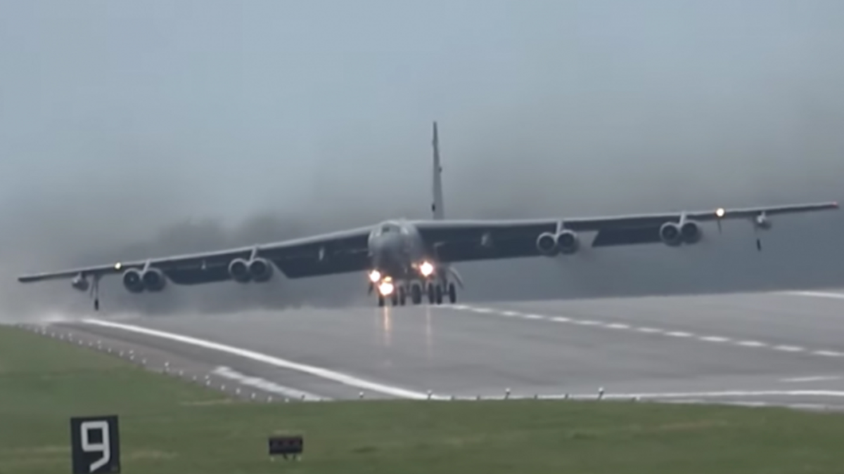 Ảnh hưởng của gió mạnh, máy bay B-52 của không quân Mỹ chao đảo và nghiêng vài độ so với hướng bay trước khi cất cánh trên đường băng RAF Fairford ở Anh.