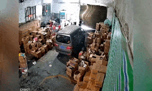 Mưa to và gió lớn ở Trùng Khánh, Trung Quốc khiến cửa cuốn một nhà kho bị thổi tung.