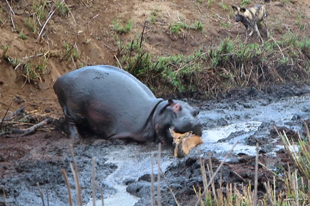 Đoạn video được kiểm lâm Pieter Van Wyk tình cờ ghi lại tại Khu bảo tồn động vật hoang dã Mala Mala ở Nam Phi. Trong đoạn clip, con hà mã tỏ ra bực tức khi thấy bầy chó hoang đang cắn xé con linh dương non nên lao tới tấn công dữ dội.