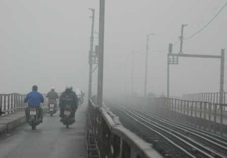 Theo ghi nhận của PV, sương mù bao phủ khắp Hà Nội khiến các phương tiện giao thông đều phải bật đèn và di chuyển rất khó khăn do tầm nhìn bị hạn chế. Các khu nhà cao tầng mất hút trong màn sương.