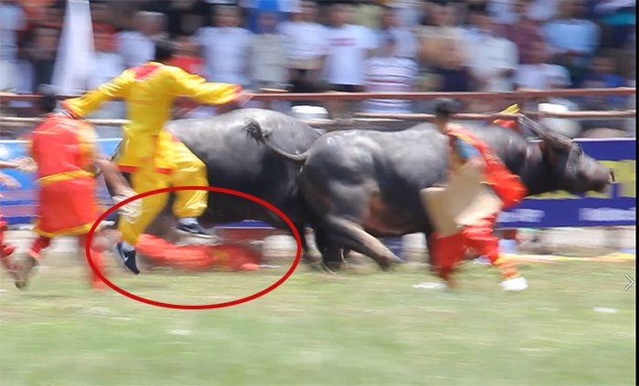 Video: Hãi hùng ông chủ trâu ngã lộn nhào trên sân bị hai 'ông trâu' phi qua người (Minh Khang)