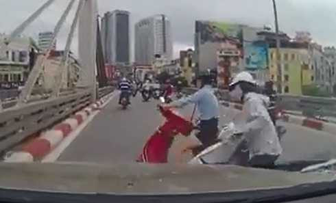 Nhiều người đi đường đã dừng lại để đỡ hai người phụ nữ này dậy, trong khi đó người đàn ông đi xe máy phía trước đã phóng xe rời khỏi hiện trường.