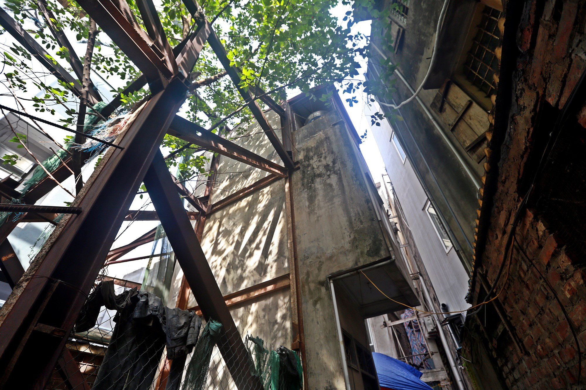 Video: Hàng chục nhà dân xiêu vẹo, phải 'chống nạng' sắt vào chung cư ở Hà Nội