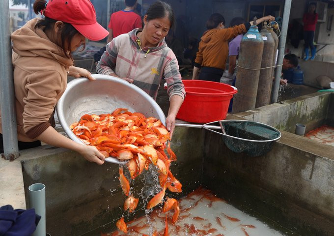 Những ngày này, hàng chục ô tô và thương lái xếp hàng ở làng Thuỷ Trầm (Phú Thọ) chở cá đi khắp các tình phía Bắc.
