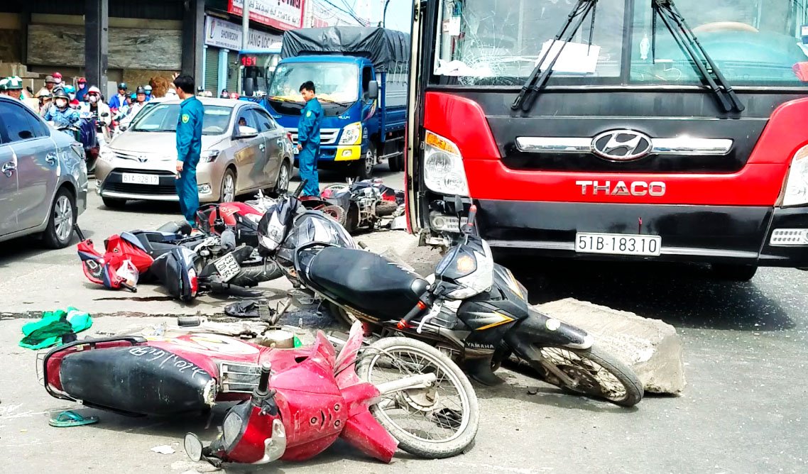 Video: Hàng loạt xe máy nằm la liệt sau khi bị xe khách cuốn vào gầm ở TP.HCM