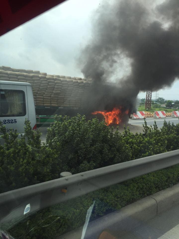 Đang lưu thông trên đường cao tốc Pháp Vân - Cầu Giẽ, chiếc xe đầu kéo chở xi măng bất ngờ bị bó phanh, nổ lốp rồi bốc cháy ngùn ngụt khiến giao thông ùn tắc.