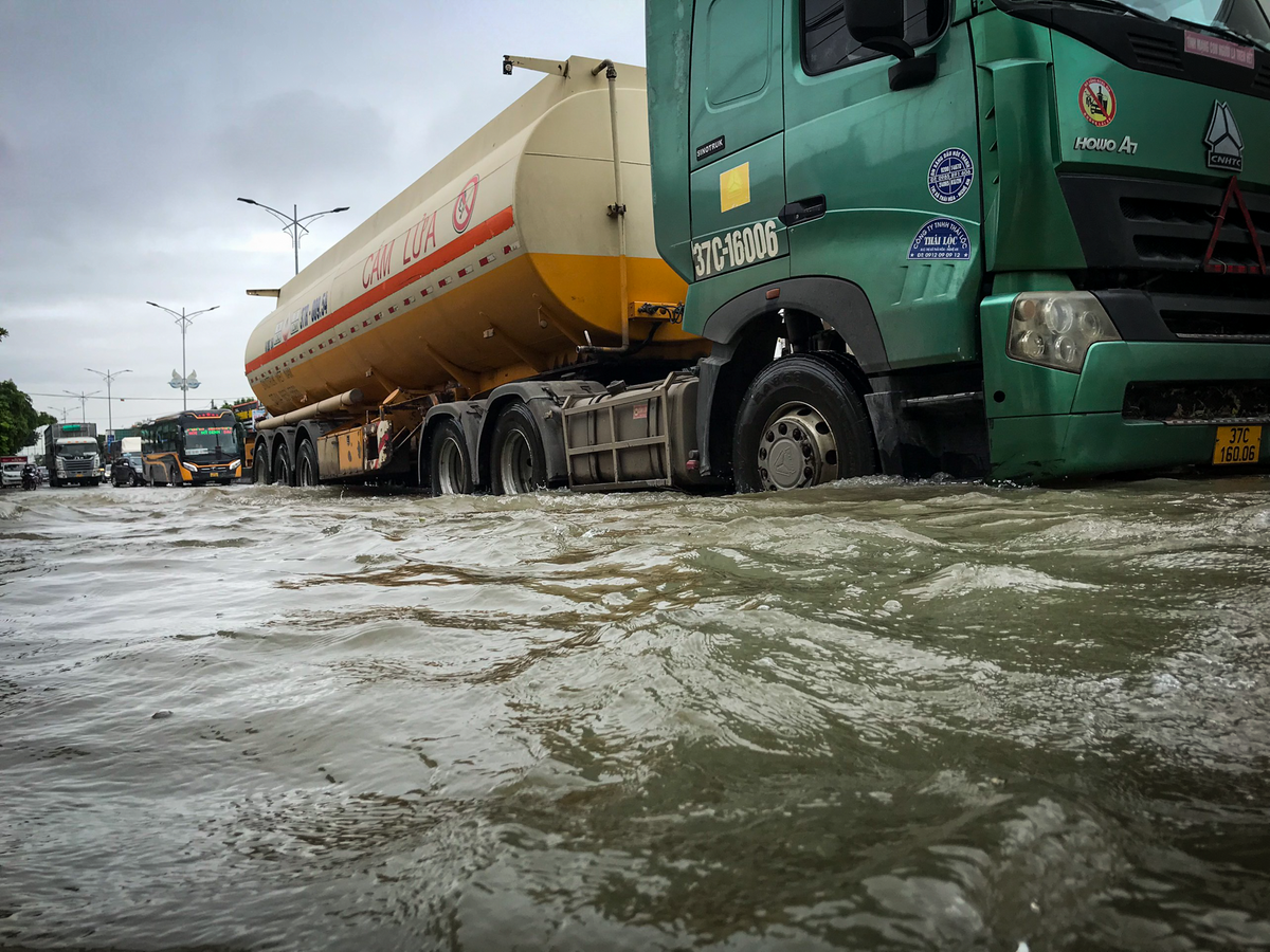 Trưa 30/9, hàng trăm ô tô nối đuôi nhau qua đường ngập trên quốc lộ 1A, đoạn qua thị trấn cầu Giát (Quỳnh Lưu, Nghệ An).