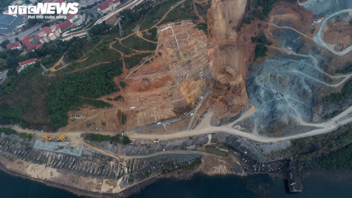 Từ trên cao, hiện trường sự cố sạt lở tại công trình Nhà máy thuỷ điện Hoà Bình mở rộng loang lổ vệt dài của mảng đất lớn bị cuốn trôi từ trên cao xuống.