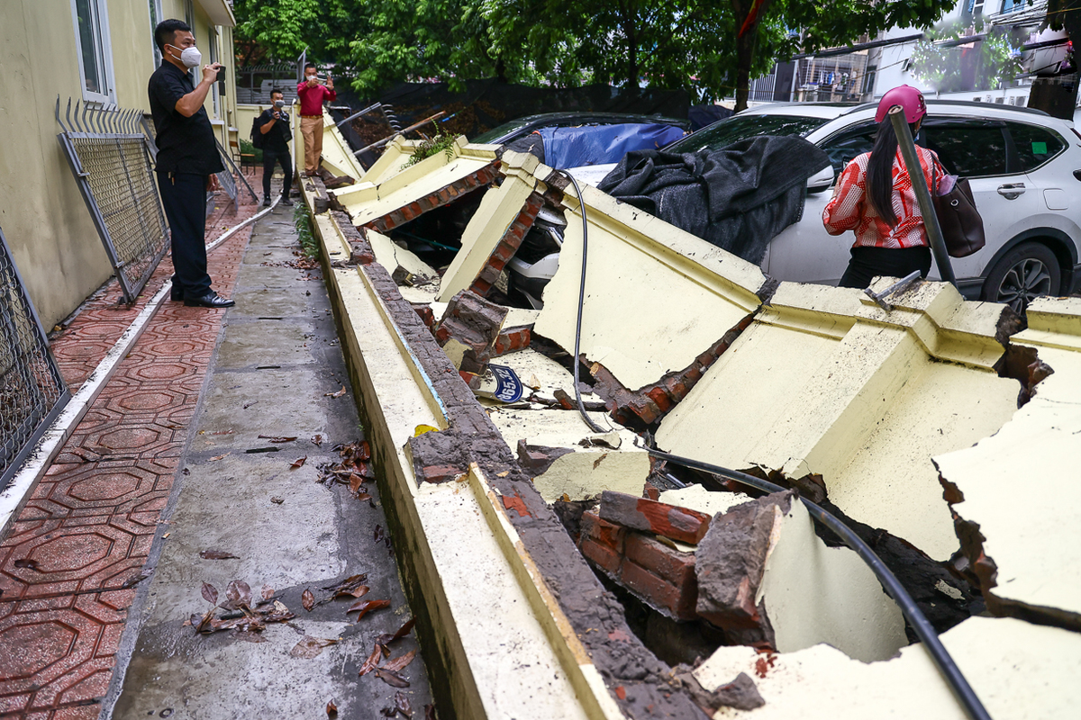 Sáng 8/7, bức tường cao gần 3m, dài 20m tại tại ngõ 245 Mai Dịch (Cầu Giấy, Hà Nội) đổ sập, khiến 13 ô tô đỗ trên vỉa hè bị đè bẹp, hư hỏng phần đầu.