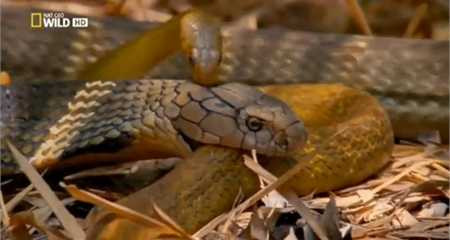 Rắn Boomslang, một trong những loài rắn độc châu Phi nổi tiếng đang săn chuột thì bất ngờ gặp hổ mang chúa.