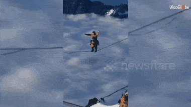 Người đàn ông tên Sam đã hóa trang thành khủng long đi trên dây ở độ cao 1.500m tại Stoos, Thụy Sĩ.