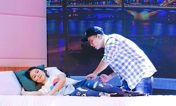 Khi câu chuyện đang gây tò mò cho nhiều người, màn hình chiếu bất ngờ được xoay ngược lại và cặp đôi Minh Khôi - Diệu Hiền lộ diện ngay trên sân khấu với bối cảnh như đang ở trong một khách sạn.