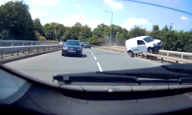 Chiếc xe tải trắng tránh một xe ô tô khác đã đánh lái quá đà sang bên trái. Mất kiểm soát, xe này va vào thành đường và trượt một đoạn dài trước khi lật nghiêng và suýt rơi xuống con đường đông đúc bên dưới