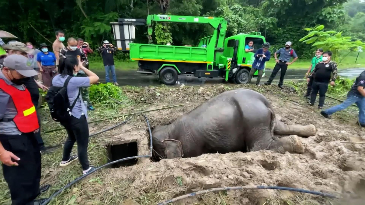 Video: Hơn 3 giờ cứu voi mẹ và voi con ngã xuống cống nước ở Thái Lan