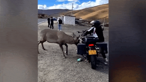 Chú hươu hoang dã tại khu tự trị Tây Tạng, Trung Quốc liên tục húc vào chiếc mô tô khiến chủ xe phải vật lộn với con vật.